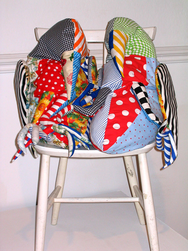 Using toys, given as free gifts to entice children to eat at fast food outlets, I scaled up the small toys and using a variety of cheap and cheerful fabrics I made a series of sculptural works.