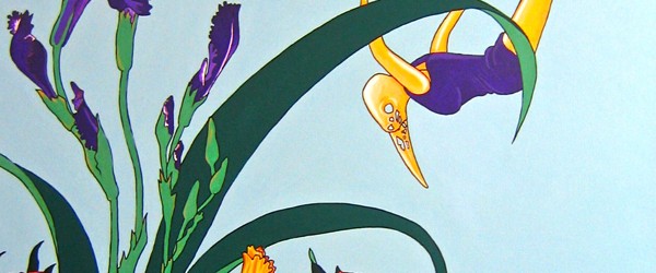 Guardian – mixed media, bonsai sycamore root, found plastic budgerigar, feathers, egg, gold leaf