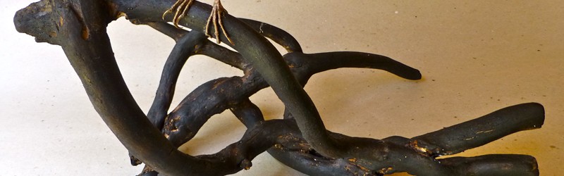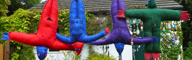 Female deities based upon Ancient Egyptian ‘Paddle Dolls’ weathering in my garden. Subjecting them to sun and rain softens the harsh colours of fabric