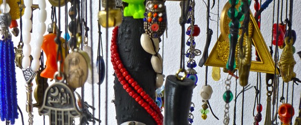 Detail of Three Sheelas, soft sculptures of felt and knitting